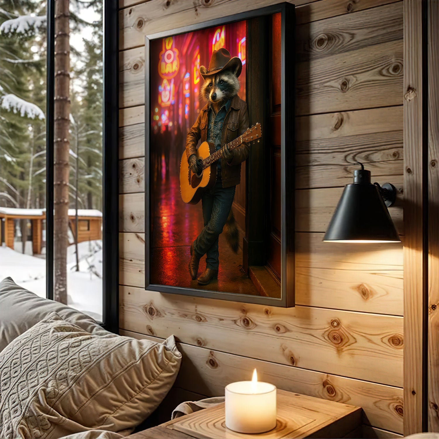 Broadway Street Raccoon Canvas Wall Art, Country Music Guitarist In Cowboy Hat, Home Decor For Man Cave Lovers
